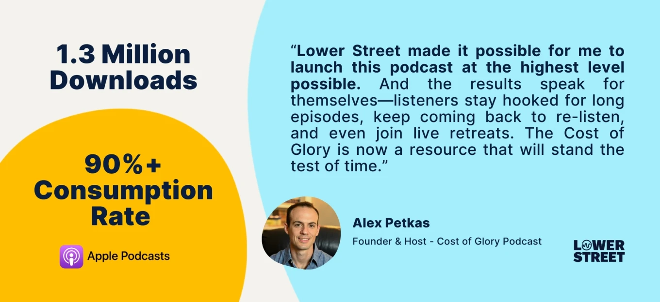From the start in 2021, Lower Street helped Alex refine the show’s identity, sound, and production. Through expert editing and strategic support, the partnership transformed The Cost of Glory into a polished, engrossing experience.