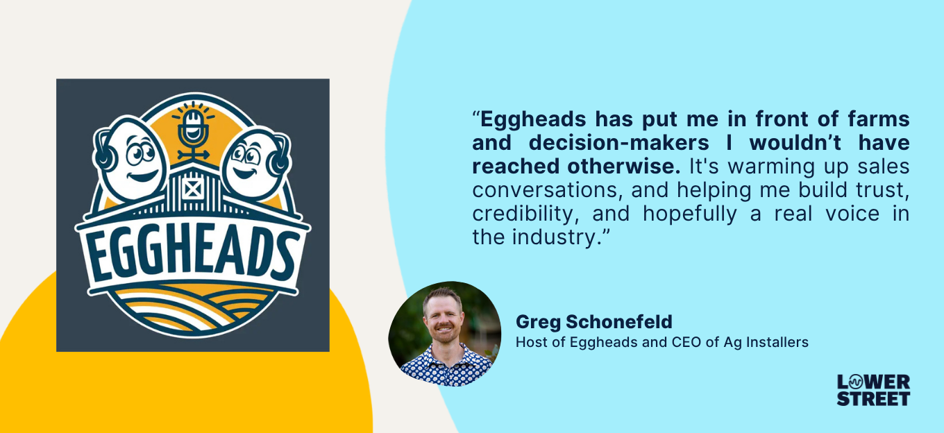 With Eggheads, Greg Schonefeld started a conversation the egg industry didn’t know it needed. Through curiosity and connection, the show has built trust, sparked ideas, and helped position Greg as a rising voice in modern agriculture. And with Lower Street behind the scenes, the show is set up not just to continue, but to keep growing.