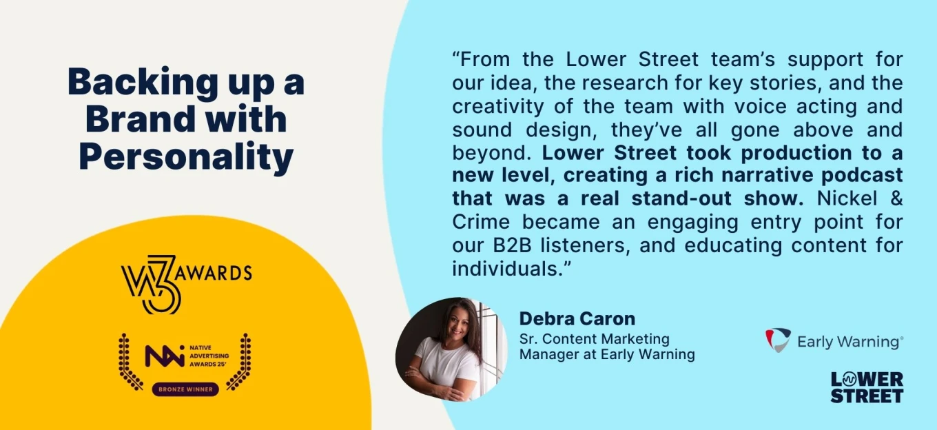 Lower Street was able to take Early Warning’s idea and help them make it better. Through story selection, research, creative voice acting and sound design, and solid tips, Nickel & Crime brought stories to life but also educated listeners. It truly stands out in the area of B2B podcasting, as well as the genre of True Crime.